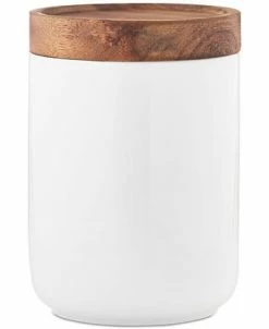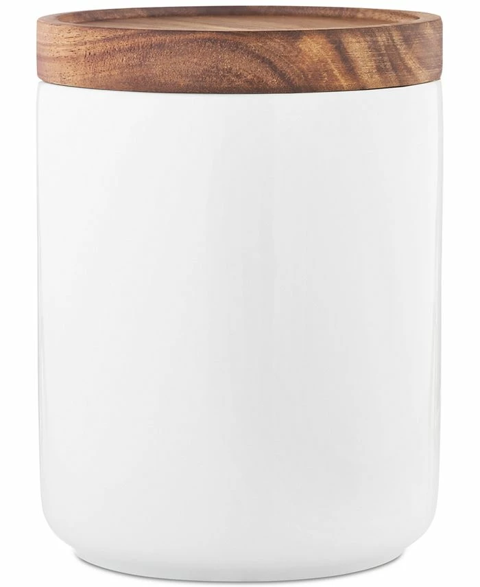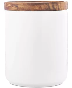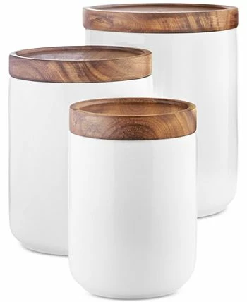 Add a functional and stylish element to your kitchen counter space with the crisp porcelain and wood lid design of this versatile three-piece canister set from Tabletops Unlimited.