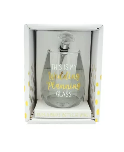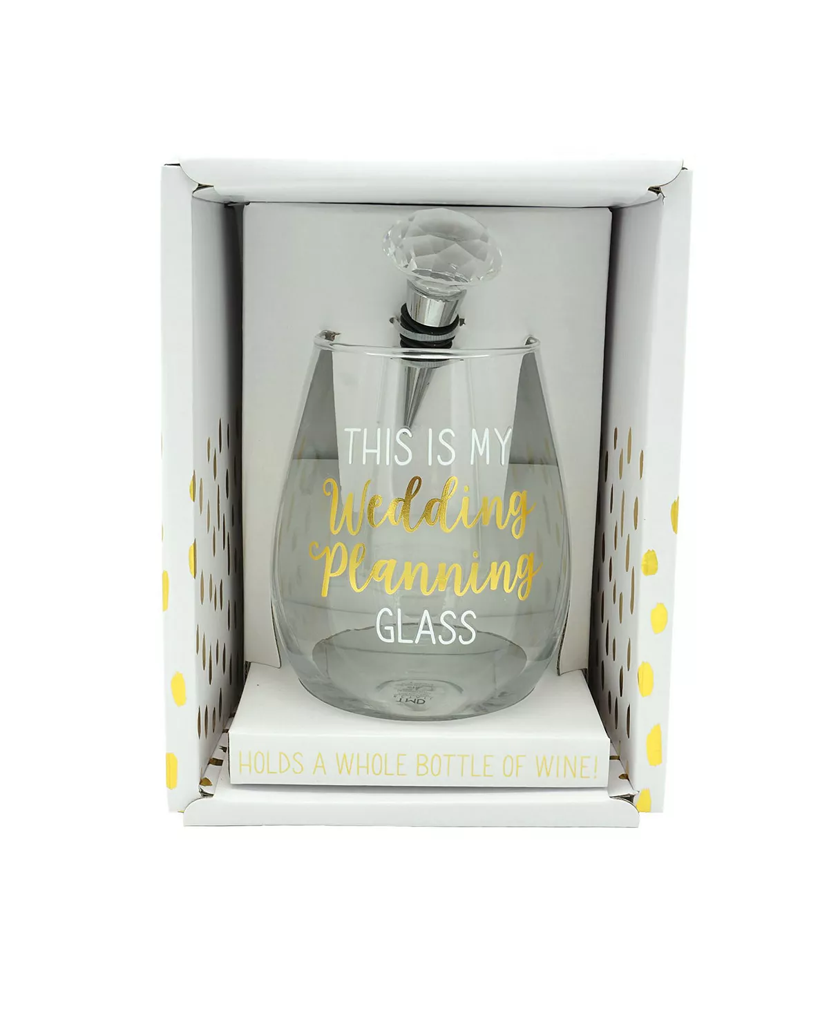 Oversized stemless wine glass sure to help you through the crazy wedding planning. Cute bottle stopper to go in your favorite bottle of wine. Both a great combo to have while wedding planning.