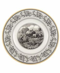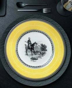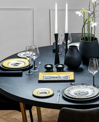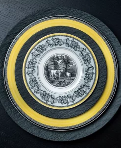 Villeroy & Boch’s charming Audun collection was inspired by life on the French countryside. The classic toile pattern has been updated in a stunning palette of black and yellow set against creamy white premium porcelain. Choose dinner plates from four mix and match patterns. Dishwasher and microwave safe. Villeroy & Boch has been creating distinctive tableware since 1748. Made in Germany.