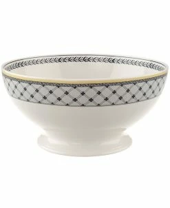Audun’s serving pieces coordinate with the yellow, black, and white mix-and-match dinnerware pattern. In Ferme, featuring a quaint French farm scene.