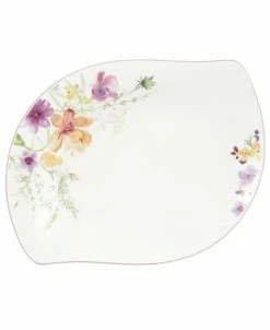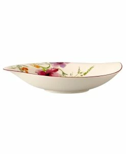 Prolong spring with this shallow Mariefleur serving bowl. Splashy colors adorn premium white porcelain edged in red and crafted in a whimsical leaf shape. Mix and match with New Cottage dinnerware, also by Villeroy & Boch.
