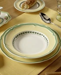 Bring the lush bounty of the French countryside to your table with this vibrant mix-and-match dinnerware and dishes collection from Villeroy & Boch. This scalloped bread and butter plate is available in four complementary patterns. The Fleurence pattern has a pale yellow center encircled with a garland of summer fruits. The Valence pattern has a yellow rim that surrounds a painted bunch of cherries in the center. The Orange pattern features a green and yellow trellis on the rim while the Vienne pattern is white with a yellow rim that’s framed by green edging and the recurring leaf garland.