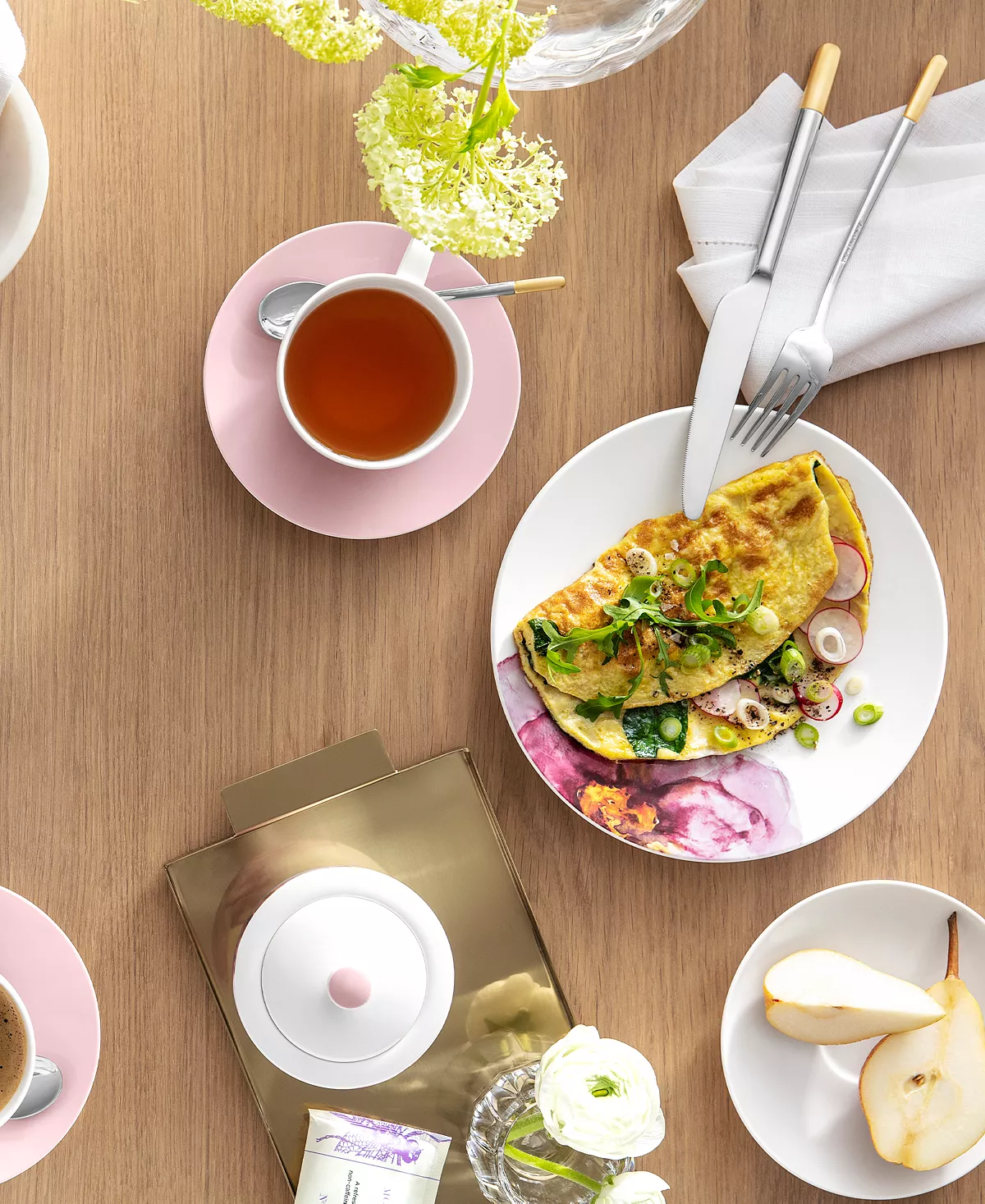 Rose Garden is inspired by the spring, when the sunlight hits the fresh greenery rosebuds. The design is highlighted by soft shades of pinks and reds stylized rose blossoms. Add watercolor florals to your home with Rose Garden. Villeroy Boch has been creating premium tableware since 1748.